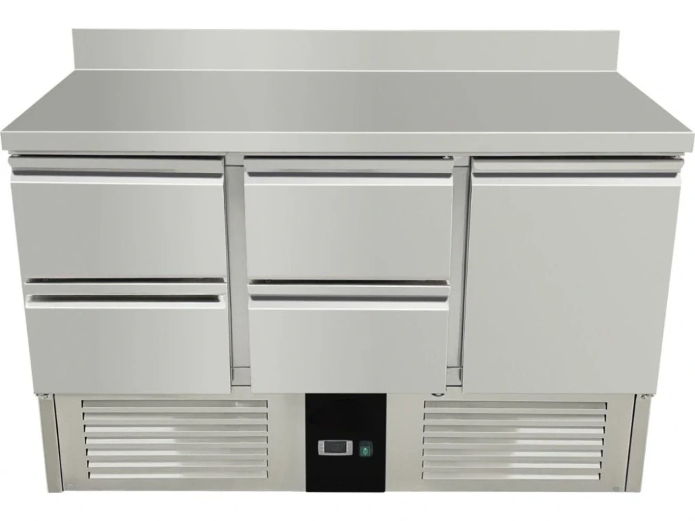 Chladící stůl / přípravný stůl 1,37 mx 0,7 m - s 1 dveřmi a 4 šuplíky vlevo a zadním lememSkladem 38 ks32 314 Kč/ ks26 706 Kč bez DPH