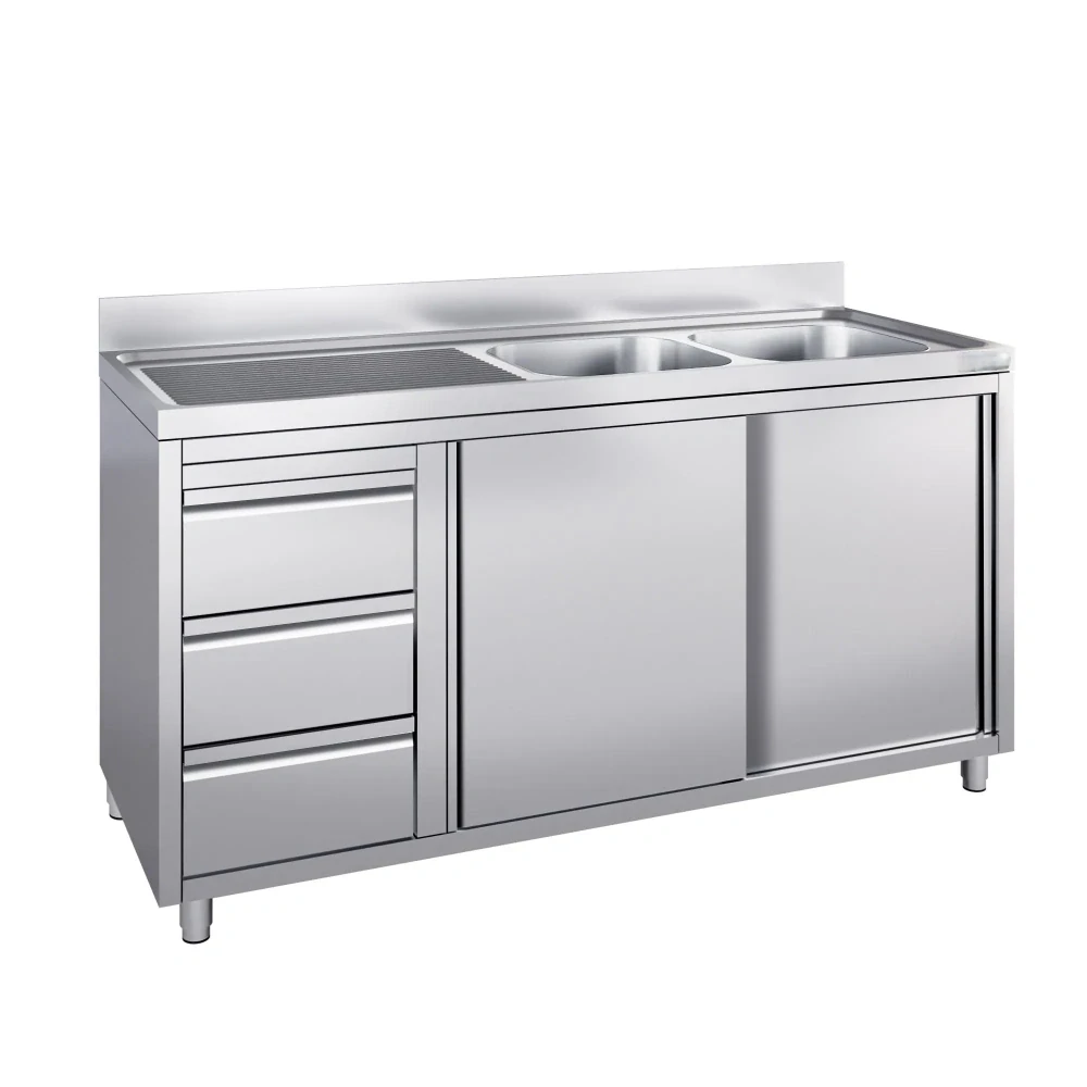 Profesionální nerezová gastro dřezová skříňka 2000×600 mm je navržena pro náročný provoz restaurací, jídelen, bister a výrobních kuchyní. Kombinuje mycí část se dvěma dřezy, praktický úložný prostor se zásuvkami a uzavřenou skříň s posuvnými dveřmi. Díky kvalitní nerezové oceli je odolná vůči korozi, snadno se udržuje a splňuje hygienické požadavky pro práci s potravinami.