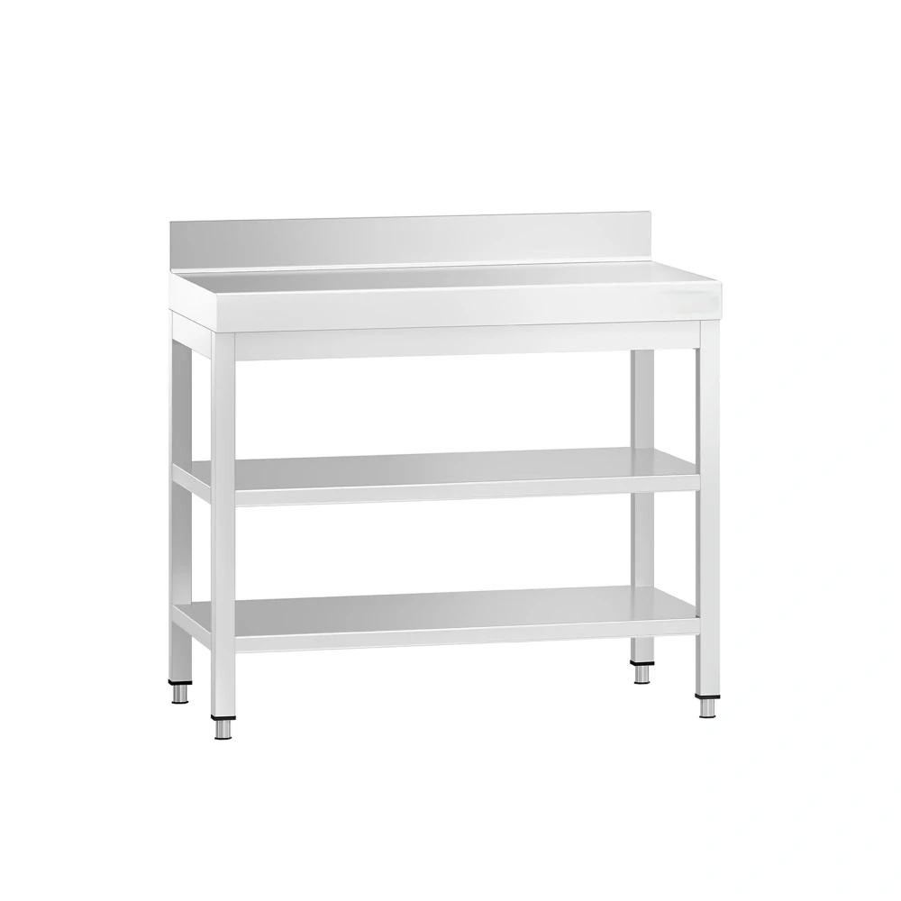 - Nerezový pracovní stůl s 2 policemi a zadním lemem