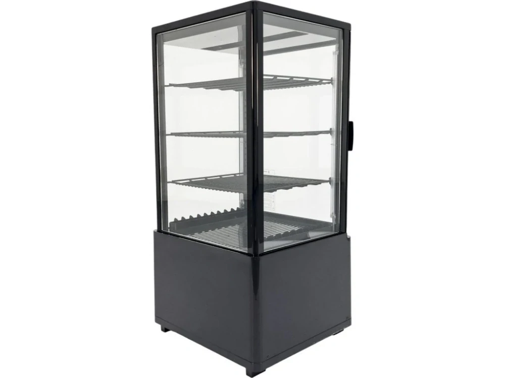Tato panoramatická chladicí vitrína o kapacitě 68 litrů je ideální pro atraktivní prezentaci i spolehlivé chlazení dezertů, dortů, nápojů a dalších produktů. Díky čtyřstrannému prosklení nabízí maximální viditelnost vystaveného zboží, zatímco moderní černý design se hodí do kaváren, cukráren, restaurací, hotelů i obchodů.