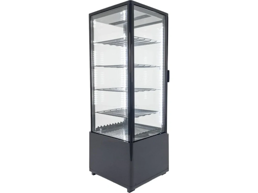 Tato panoramatická chladicí vitrína s kapacitou 98 litrů je ideálním řešením pro efektivní chlazení a atraktivní prezentaci vystavených produktů. Je vyrobena z kvalitního ABS plastu v elegantní černé barvě, která vitríně dodává moderní a profesionální vzhled. Díky svému univerzálnímu designu se hodí do kaváren, restaurací, cukráren i maloobchodních prostor.